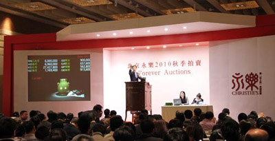 内地唯一获佳士得商标授权的北京永乐在11月23日开始了其2010秋拍的首日拍卖,上午进行的是中外名酒的拍卖,包括茅台和来自法国顶级酒庄的红酒。下午的瓷器及工艺品的拍卖场面火爆,原预计4个小时的拍卖进行了近7个小时,买家竞价频频,场面十分热烈。