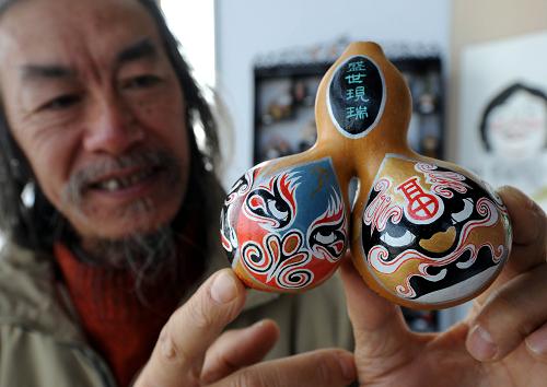 江苏民间工艺美术师王东元在展会上展示他用一只连体葫芦创作的葫芦工艺品。