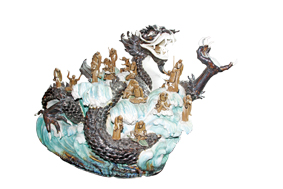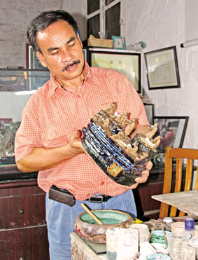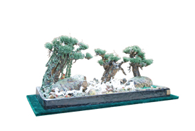 不过,刘国祥也表示,以前的石湾微塑题材较单一。由于都做成单件的“山公”,或是人物或是亭台楼阁,一般都是放在假石山上作为装饰,也不怎么追求精细,因此这个行当的发展一直比较缓慢。直到他的上一辈才首次以微塑盆景作为表现形式出现,方才大大拓展了石湾微塑的题材领域。微塑盆景可以将祖国的大好河山浓缩到一个盆景中进行表现,而且做工更加精细。