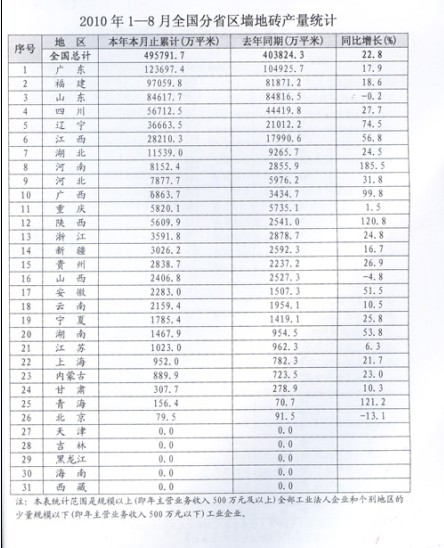 2010年1—8月全国分省区墙地砖产量统计