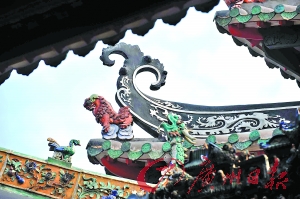 到过祖庙的人都知道,在灵应牌坊上,有难以数清的瓦狮、鳌鱼。经过了这次百年大修,你可以尝试去分辨一下牌坊顶上的鳌鱼哪一只是原件,哪一只是新烧制的。而牌坊上面的垂脊,也能从新旧“拼凑”中挖掘到修缮的痕迹。