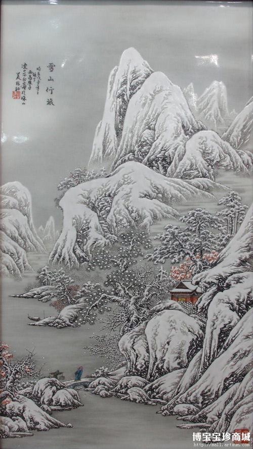 凌宗正粉彩《雪山行旅中堂》瓷板 (图片来源:博宝宝珍商城)
