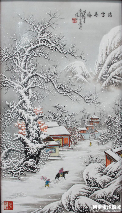 凌宗正粉彩《踏雪寻梅》瓷板 (图片来源:博宝宝珍商城)