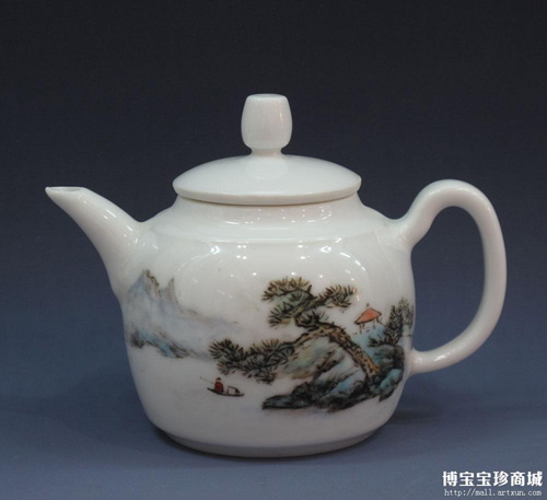 图中展示的这件来自于博宝宝珍商城的粉彩山水壶也是王桂英女士的作品,作品既有文雅气韵,劲秀有力,又形神俱到,意境深远,胎质细腻,胎底色为洁白如玉,纯净无暇,线条滑润流畅,构图简洁明了,意境宁静高远。这件粉彩山水壶是不可多得的当代瓷器艺术佳作,非常值得收藏观赏,体现悠悠意境。(博宝艺术评论员 孙瑞峰 撰文)