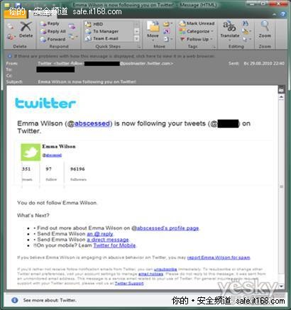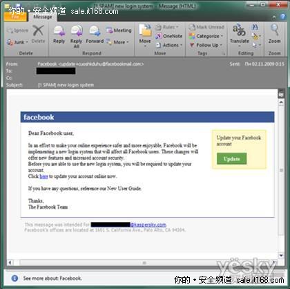 社交网络现在愈加流行,很多人都有Facebook、Twitter等等社交网站的账号。有时,我们会在其中发现一些假冒的提醒邮件,而这些假冒邮件的目的是窃取用户的个人数据,获取对用户社交网络账号的访问权,这与针对银行的钓鱼诈骗非常相似。首先用户会收到一封自称是来自某个社交网站的提醒邮件,邮件中声称有人给你留言或者希望加你为好友,或者你需要更新账户信息。如果你点击其中的链接,将会被引导到一个假冒的网站,用户如果在此网站输入了用户名和密码,就会被发送给网络诈骗者。