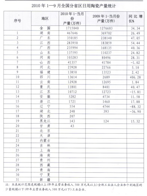 2010年1—9月全国分省区日用陶瓷产量统计