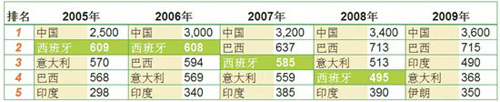 表一:世界陶瓷生产大国产量前5名排行榜(2005年-2009年)