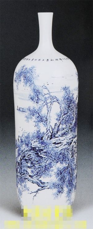 达民的瓷展上既有无数的青花作品,又有别具风韵的粉彩和浅绛彩作品。观者目不暇接。观其粉彩作品无论是山水、花鸟都给人富贵雍容的视觉效果。粉彩是多种钴色在陶瓷上的运用,古人画粉彩多以工笔为主,近代尤以民国汪晓棠、潘匋宇为最。而达民既能追溯古人,又能突破传统,不拘泥于传统。把用于浅绛写意的手法结合于粉彩制作,创作出兼工带写的艺术效果,典型的作品如《家在江南黄叶村》、《过分水岭》、《榕阴图》等。浅绛山水用色洒脱,如色釉瓷瓶《黄山烟云》、《群峰叠嶂》等栩栩如生、色调淋漓。他把粉彩色层厚和浅绛彩色层薄的艺术在陶瓷上呈现得淋漓尽致。达民的青花作品更是他的强项。他研究烧制青花多年,为此付出不少心血。青花瓷虽然是单色瓷或少数彩,但创造出诗化般的意境历来是陶艺家为之奋斗的目标。青花瓷的魅力是在单色中又墨分五色,尽显浓淡枯湿。装饰性和夸张性是无与伦比的。历来青花艺术家更注重的是它的写意性。以洒脱、自由、出神的形象结合诗与画的完美统一,从而创造出诗化般的意境。青花瓷的制作过程也较为冗繁:起稿-过稿-勾线-施釉-烧成,难度较大。往往陶瓷艺术家借青花瓷来抒发自己的情感,表达作者的追求,让众人在联想中产生共鸣,这就是青花艺术的真谛。达民正是因为谙熟了这些真谛,才倾注了满腔热情,用笔唱出了他自己心中的“歌”。他绘的青花山水,曼妙秀逸、浑厚华滋。笔法既有传统又具创新,画面更是陈兵布将,惨淡经营。他的作品大度雍容、水分充足、雅倩养眼、出神入化。总之达民对青花瓷已把握得十分地道。他使绘画和陶瓷艺术有机地融合,就如蓝天包容着白云一样,那么协调、清澈。