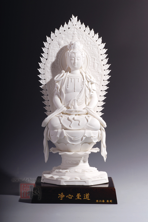 陈仁海大师的《净心至道》作品,选材之精、工序之繁、技艺之难、工艺之精,均体现了德化佛瓷“华缛之极,无上之品”的风范,代表了德化当代佛瓷的至高水准。瓷质细、白、光润通透,扎道纹饰精细华丽。观音形状端庄,宁静秀丽,姿态温婉动人,神态超凡脱俗,给人以慈悲亲切的感觉。