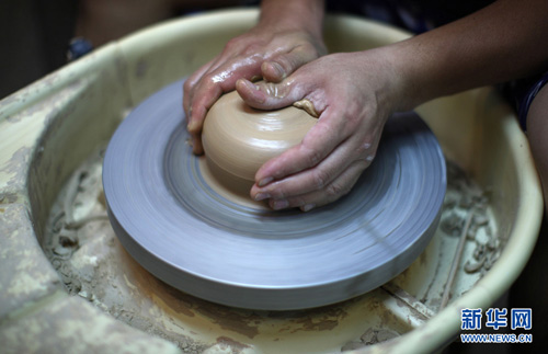 在莺歌镇的一个陶艺工作室里,制陶师傅蔡青峰在拉坯。