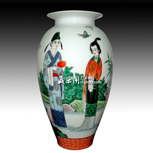 古彩,以五色竞妍、富丽堂皇、线条刚劲、形象概括、构图圆满,具有浓郁的中国民族艺术特征而著称于世。在现当代从事古彩创作的艺术家中,中国工艺美术大师戴荣华老师是当代古彩真正传人,古彩这一艺术奇葩在他手中推到了登峰造极的水平,是名副其实的“当代官窑”。此次展览活动有两件古彩精品首次亮相藏乐阁,一件是2007年曾经拍卖过的《红叶传情》,一件是2010年戴荣华老师创作的精品《人面桃花相映红》。两件作品人物神态各有特点,让人不由得想起“三千粉黛无颜色“这个经典绝句。
