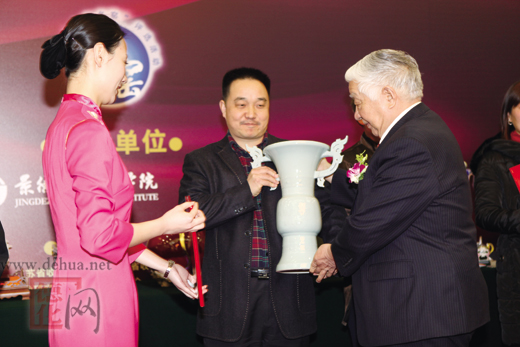 原全国政协副主席王文元向“当代十大名窑”获奖者中国白陈仁海颁奖