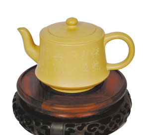 在孔良法的案头,常常会摆着一些紫砂壶,不同的器型,不同的泥料。他看似不经意地摆放,其实一直在心中构思,如果哪一天灵感来了,就会提刀(刻刀)挥洒。他的陶刻有一个特色,兴致来了的时候随意泼墨,全不顾尺面大小。但是这样写来,疏密有致的排列,反而更有自然的意趣在里面。