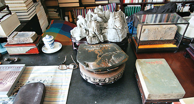 王靖宪的夫人忙着给我们倒茶,指着塞满了书籍、石头、陶瓷的客厅笑着说:“你们看,家里有空儿的地方都被他给占了。”从她的语气和眼神里,可以明显感觉到她对王老的这些“宝贝”也是极为疼爱。