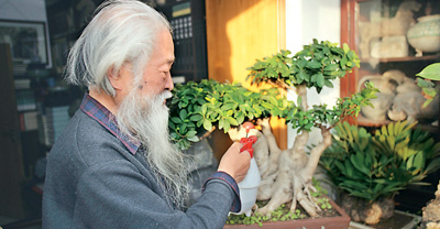 阳光透过窗户照落进来,洒在窗台旁的盆景上,樟树散发出淡淡的清香,榕树也泛着墨绿色的光芒。王老指着这些陪伴自己的盆景笑着说:“盆景也是中国文化的一部分。”