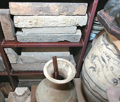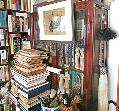 走进小小的书房,就被各种书籍吸引,还有他亲自修补装裱的碑帖,再加上“见缝插针”的各种古陶瓷,在屋里转身都有些困难。