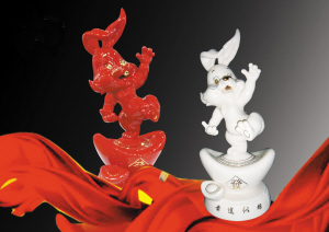 日前,中国·冠福家用上市公司的冠福窑艺术瓷推出了卡通形象的吉祥对兔,作品高37厘米、宽18厘米。造型寓意“前途似锦”。对兔为红白两色,手工描金,呈站姿,立于金元宝上,夸张的舞蹈动作,祈求来年风调雨顺、吉祥如意。