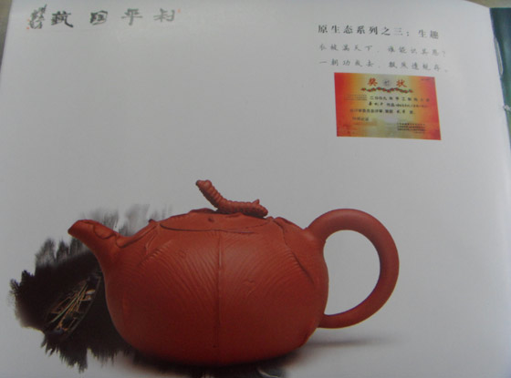 继而有三,在一次工作之余的田间散步中,见一老农在屋前菜园子里捉青虫,蔡利平有些疑惑便问:“何不治虫?”老农说道:“现在讲究绿色食品,少用农药为好,有虫勤捉,有少许虫眼,客户也认可,吃得也放心。”老农的一席话让蔡利平产生了创作灵感,回来后,他制作了一把“生趣”壶,壶身是一颗卷心白菜,壶盖上青虫翘首,活灵活现、惟妙惟肖,令人赞叹……