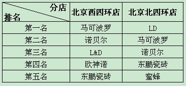 北京红星美凯龙其他店面瓷砖品类销量排名:
