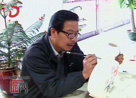 来自北方的郑培熙,一到江南,就感受到了江南早春景致与北方的不同,这让他很有创作的激情。只见他神情专注地在陶瓷坯上作画,随着手腕灵巧的抖动,以及笔法的或挑或勾,或点或划,陶瓷坯体上就留下或淡或浓的墨彩,不一会儿,盛开的鸢尾花、水仙花、在水中嬉戏的鸭子,在花间流连的小鸟便呈现在陶瓷坯上。郑培熙还欣然的在陶瓷坯体上写下“春到人间草木知”等诗句。