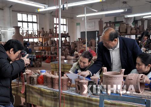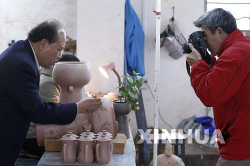 2月16日,新华社摄影记者张爱林在广西钦州市采访中国陶瓷艺术大师、国家级非物质文化遗产坭兴陶陶艺传承人李人帡。 (记者 何传明 摄)