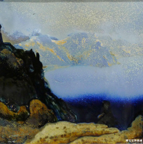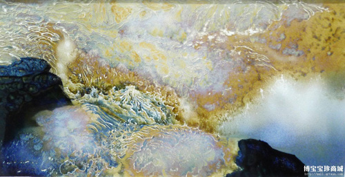 然后,正当李家正因为山水系列受到业界人士和藏家一致好评时,他又开始思考新的陶瓷艺术创作。或者生活的灵性赋予它创作的激情,又或许丰富的人生感悟,澄澈的审美思维和浓厚的书画功底,让他的陶瓷创作之路越走越顺。最后,李家正选择在高温颜色釉上下功夫,无数的失败没让他选择放弃。在创作第一幅作品《海涛》时,他无可厚非的开创了纯颜色釉来创作山水画,并逐步形成了他新的风格。他创作的高温颜色釉山水作品中色彩辉映、气势恢宏,《海涛》就运用了细化光和色的手法表现,振幅作品呈现出水波涌动的效果,浪花飞溅。另一幅作品《黄河之源》形象表现了壶口瀑布,高原之水,带有泥沙的咆哮而来,垂直而下,水花成雾,给人汹涌澎湃、气势磅礴之感。