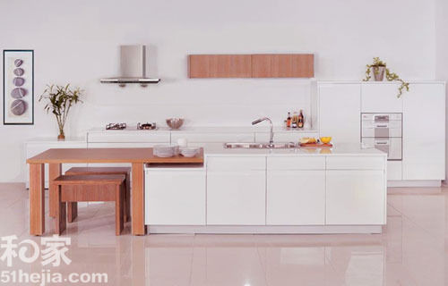编辑点评:简单的一字型设计,配合形状特别的岛台,让整款产品看上去清新可人,不带一丝造作。樱花春绿几许橱柜完全没有繁复的修饰,只是单纯的以木纹配上纯净的白色表面,让厨房看上去永远都那么安静淡然 ,坐在里面喝杯咖啡,没有一丝杂念。