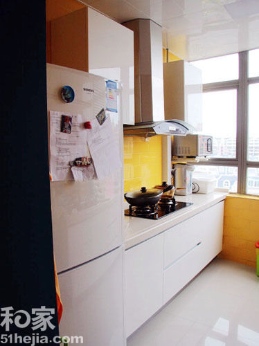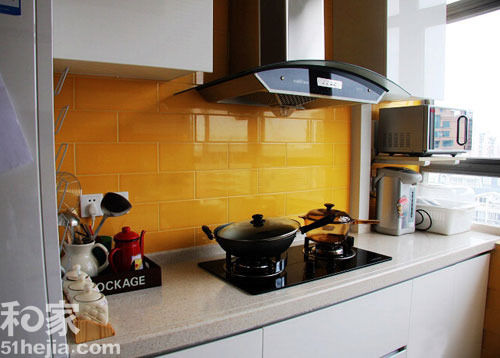这个厨房来自一个混搭北欧风的靓丽小家,到了厨房空间也延续了整个家靓丽简约的风格;白色的简约橱柜但看算不上特别靓丽,但整体的厨房空间采用了橙黄色的瓷砖打造出一种活力的感觉,白色的简约风格橱柜在这空间中也更添时尚靓丽的感觉了。