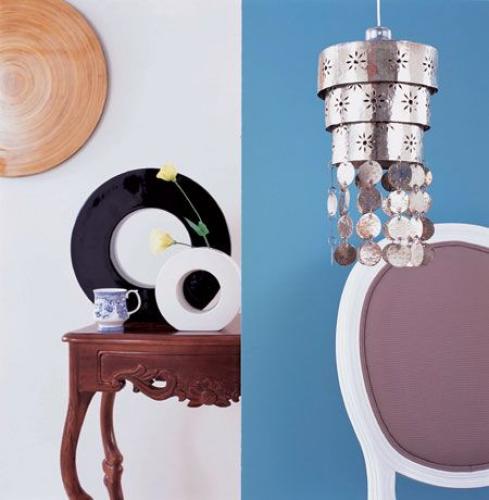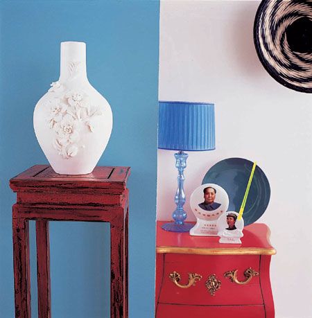 白色陶瓷花瓶,朱色中式花架,中西结合竟相得益彰。红色镶金边的老式小几上,两个波普风格的瓷质毛泽东头像,运用现代材质设计的蓝色典雅风格台灯,荧光筷子与略带一丝禅意的彩漆装饰盘,以及墙上的印尼风格的黑白斗笠。不可能搭配在一起的组合,却取得出奇制胜的效果。