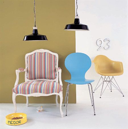 两盏简约风格的黑色铝制吊灯,黄、蓝两把现代设计的靠背椅,鲜明纯净的色彩与古典扶手椅的条纹图案自然融合,而地上放着的小狗餐盆透出一丝谐趣与童真的意味。