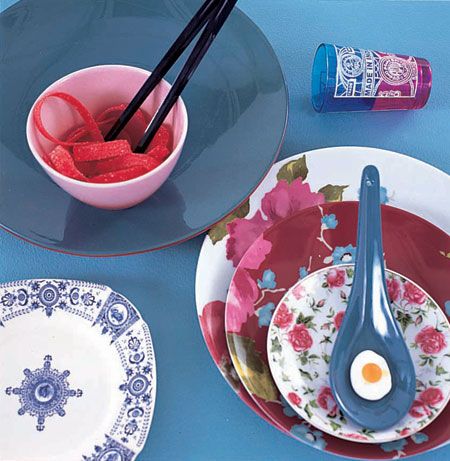 蓝色的桌布上,传统的青花盘和略带禅意的蓝色素盘呈现出素净和清淡的中国东方风情;而一旁的一组充满浓浓春意的花卉图案套盘,则让你联想到春日午后舒适的英式下午茶时光。蓝色基调中的点点红色,造就出自然、精致的“混搭”效果。