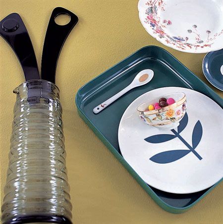 花色陶瓷杯碟,叶饰餐盘,小勺,托盘,色拉餐具,小口高杯。芥末黄、海军蓝、白与小碎花的搭配,给人的感觉像一股微风吹过一样清新、明快。