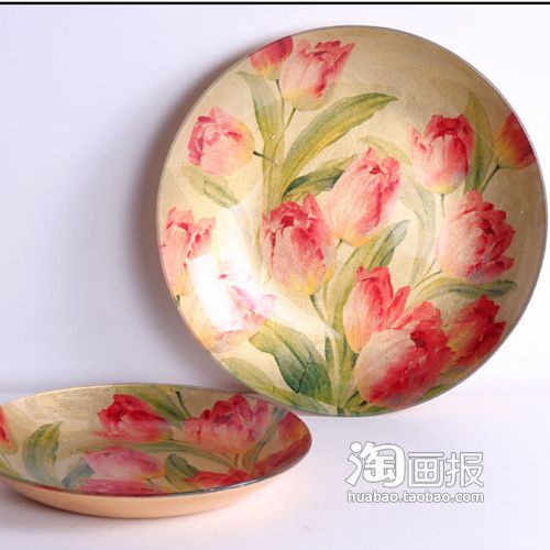 盛开郁金香小号圆形玻璃果盘贴金箔水果盘子餐饮用具