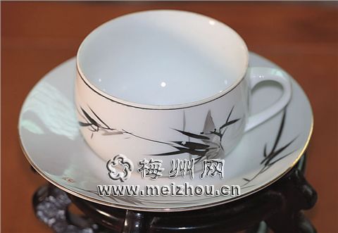 “里根杯”的口径宽为8.2厘米,高为5.5厘米,周身呈胎白色,由正宗德化瓷烧制。该杯瓷质纯白,釉面润透,属咖啡杯造型,一杯配一碟,以国画“瘦竹”为表图,色泽黑白对比明显。