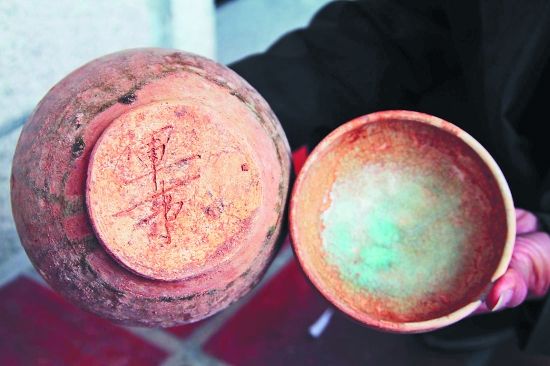 昨日,记者在晋江市紫帽镇李先生家看到三件在磁灶镇一处工地出土不久的陶瓷,其中一件底部刻有“军事”二字。