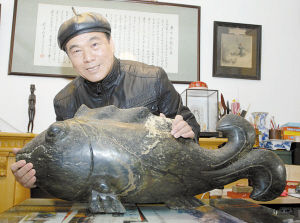 渐渐地,王晓海对“华夏鱼文化”收藏的热爱在全国都有了名气,大家知道哪里有这样的古玩都会来告诉他,不少人还会亲自给他送过来。几年前,王晓海应邀去象山考察,一位70多岁的渔老大听说他的名声后,就特意把家中一尊供奉了几代的“镇宅之宝”鱼龙石雕赠送给了他。
