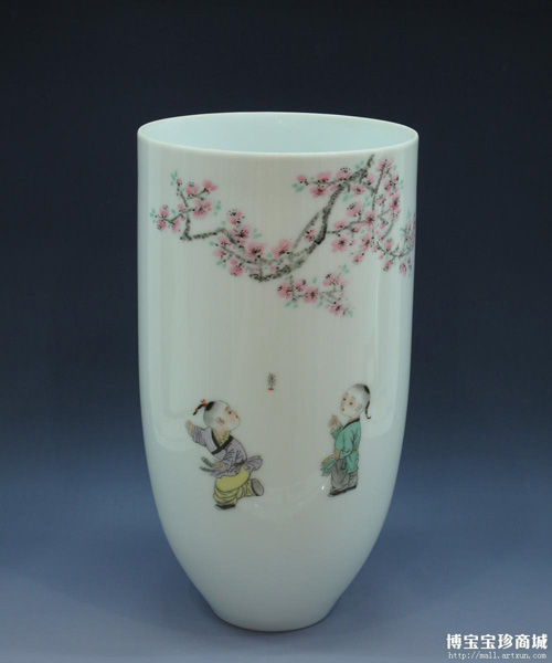 青花、玲珑、粉彩、色釉,合称景德镇四大传统名瓷,图中这件粉彩《婴戏图》瓶出自陶瓷名家王秋霞之手,这件瓷瓶画工细腻,线条工细流畅,描绘了孩童嬉戏情景,别有一番情趣,梅花的淡雅色彩勾勒唯美清新,极具艺术价值。据博宝专家介绍,王秋霞出生著名的陶瓷世家,自幼耳濡目染,受家庭影响,对陶瓷艺术有着深深的热爱。参加工作后便全身心地投入到陶瓷艺术创作之中,经过二十多年的努力逐渐成为景德镇新生一代的陶瓷美术优秀技艺人员,其作品线条流畅、简练、用笔重韵,设色多以淡雅、峻秀、所绘人物神态飘逸、自然,画面庄重典雅,给人以清丽而甜美的艺术感受。(博宝艺术评论员 秋雨 )