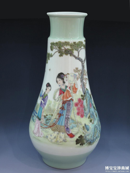 邹宝林是景德镇瓷器的制作名家,擅长粉彩人物瓷画,兼长图案、翎毛、山水瓷画,作品构思严谨、形式多样、设色浓艳,作品具有很强的艺术观赏性。博宝网中展出的这件豆青釉瓷瓶《人物游园品茶》是由邹宝林所作,瓷瓶造型独特,淡雅柔和,色浅处淡若湖水,淡雅釉色衬托下的色彩,使瓷瓶显得更加艳丽妩媚,瓷瓶上的女子端庄典雅,可谓是将绘画与陶瓷艺术完美的结合,极具艺术欣赏价值。