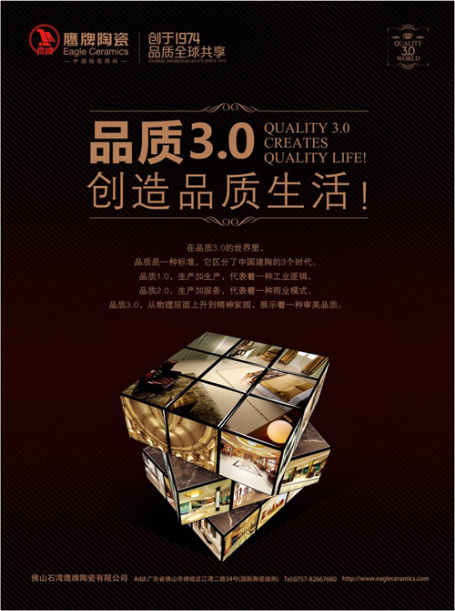 正是鹰牌陶瓷拥有如此卓越的品牌品质、产品品质和服务品质,品质3.0应运而生,为中国陶瓷行业带来全新的品质思想,以大浪潮的姿态引领陶瓷行业品质全面升级。但是品质3.0绝不是鹰牌陶瓷品质发展的终点,率先进入品质3.0时代的鹰牌陶瓷,势必以更严格的要求来加强自身品质建设,时刻谨记创新与承诺,以行业领跑者的姿态站在行业发展的最前端,大胆接受市场的考验,从企业的各个细节方面做到尽善尽美,成为具有高含金量的品牌,高技术含量的产品,高附加值的服务的品质企业,去迎接品质发展的另一座高峰,为消费者构建高贵品位的品质生活,推动中国家居文化和价值观的品质演进。