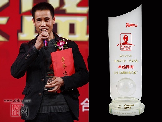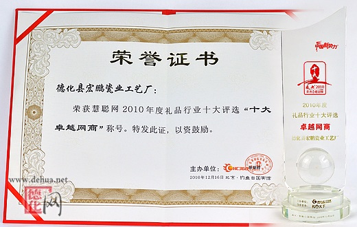 去年12月16日,“中国新势力-2010年度礼品行业十大评选”颁奖盛典在北京钓鱼台国宾馆隆重举行。历经5个多月的全国票选,“十大卓越网商”入选榜单终于尘埃落定。德化县宏鹏瓷业发展有限公司荣膺2010年度礼品行业十大评选“十大卓越网商”称号。