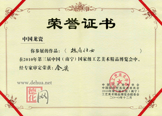 日前,中国龙瓷公司的《执扇仕女》在2010年第三届中国(南宁)国家级工艺美术精品博览会中经专家审定荣获金奖。