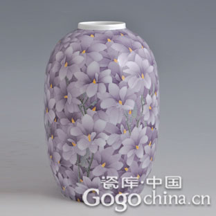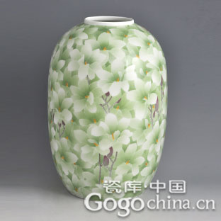 釉下金玉满堂花瓶高30cm,采用釉下分水工艺,高白玉瓷材质,灯笼瓶型。由陶瓷艺术大师陈扬龙亲手绘制。此花瓶采用釉下五彩技艺,收口鼓腹短足,通体绘玉兰满花,罩施一层白釉,体形优美匀称,轻盈秀美而不失灵动。金玉满堂花瓶以玉兰花为题,利用花型的变化,重叠构成疏密关系。通过色彩的浓淡深浅体现出众多层次,使画面满而不塞,统一又有变化。满花花瓣层次分明、清新欲滴,色泽鲜丽逼真、形态庄重典雅,花瓣格外生动逼真,衬托出釉下五彩瓷器特有的高雅品味。金玉满堂花瓶以玉兰为寓,寓意收藏者富有而有才干,满花寓意财市满室。一组共红、紫、灰、绿四只,表现同一画面又可用各种单一颜色表现出不同效果。