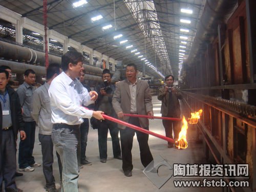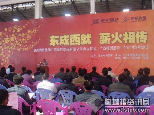 3月28日,艳阳高照,万里无云。上午11点18分,“东成西就·薪火相传”金舵企业广西新舵陶瓷有限公司一期工程(1#窑炉、3#窑炉)点火仪式在广西梧州藤县隆重举行。参加点火仪式活动的主要领导及嘉宾有:广西藤县县委书记何棠先生、县长黄东明先生、金舵企业罗董事长、广西新舵陶瓷有限公司罗董事长、金舵企业生产总经理唐总;另外还有来自藤县县委办、政府办、宣传部、陶瓷办以及政府各职能部门、金融系统、陶瓷行业兄弟企业、藤州镇、塘步镇等各级政府机关和企事业单位的嘉宾朋友200多人。点火庆典由广西新舵陶瓷有限公司杨总亲自主持。