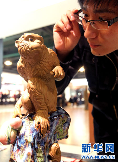 4月1日,参观者正在观赏名为《金猴兆丰年》的陶瓷雕塑