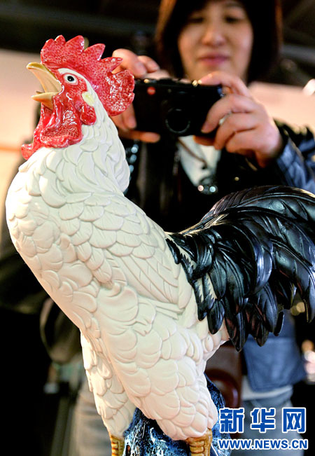 4月1日,参观者正在观赏名为《春风得意》的陶瓷雕