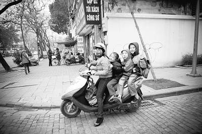 再次上路,车开进村子里,路上都是尘土,呛得我咳嗽了几声,司机停车跑到路边小摊上买了个东西又跑回来,递到我手里的是一个口罩。河内摩托车多,尘土多,空气污染的确非常严重。我问他口罩多少钱,他说很便宜的,送给你。