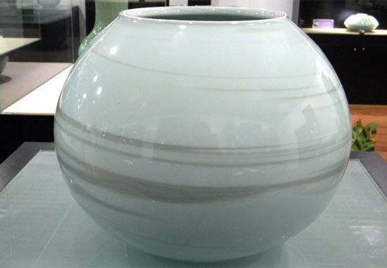 从此次参展的作品来看,参展作品《天池》采用双层拉坯法,倒置拉坯成型,器型饱满厚重,内青外白,特殊刀法刻画出的流动性线条使作品产生旋转中的率动性,一弘清泉,浩月在天,动与静的巧妙结合,使作品具有强烈的视觉效果和艺术感染力。《云水》简练饱满,流动性的绞胎纹线条粗细相间,宛如行云流水,构成了一幅江南山水画,作品诗一般的意境和独特的田园风情,让人产生无限遐想。美轮美奂,比较全面的展示了卢大师近年青瓷艺术的巨大成就。