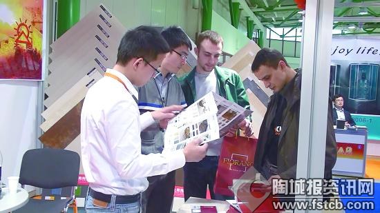 高安陶瓷在莫斯科展会上广受欢迎。图为江西太阳陶瓷有限公司佛山营销中心总经理胡尧(左一)为客户介绍公司产品