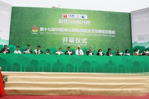 上午10点30分,佛山国际会议展览中心人声鼎沸、热闹非凡。第17届中国(佛山)国际陶瓷及卫浴博览交易会在一派喜气洋洋的气氛中正式拉开帷幕。以绿色树林图片为背景的开幕式舞台呈现出一派绿意盎然且生机勃勃的景象,象征着本届陶博会绿色环保理念。