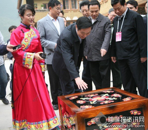 佛山市对口援建组组长刘宏葆细看陶瓷羌绣凳子